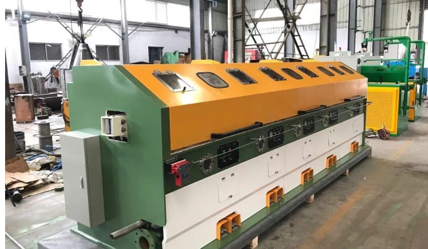 水箱式拉絲機(jī)是由多個(gè)拉拔頭組成的小型連續(xù)生產(chǎn)設(shè)備,通過逐級拉拔,并將拉拔頭置于水箱中,最后將鋼絲拉到所需的規(guī)格。就國內(nèi)幾個(gè)主要水箱式拉絲機(jī)生產(chǎn)商來看,一般配置了20個(gè)左右的拉拔頭。通過每一級的拉拔后,鋼絲的線徑發(fā)生了變化,所以每個(gè)拉拔頭工作線速度也應(yīng)有變化。在整個(gè)拉拔過程中,只需要1臺電動(dòng)機(jī)通過機(jī)械傳動(dòng)或齒輪箱來驅(qū)動(dòng)。根據(jù)拉模配置的不同,各個(gè)拉拔頭的拉拔速度也要變化。拉拔速度的基準(zhǔn)是每個(gè)時(shí)刻通過拉模的鋼絲的秒流量體積不變,即要使下式成立