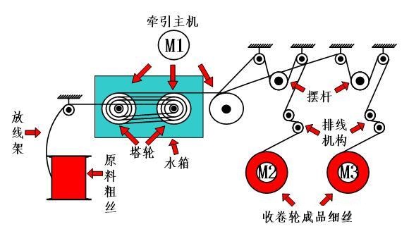 水箱式拉絲機(jī)的各個(gè)拉拔頭的工作速度就是基于以上的公式,保證各個(gè)拉拔頭同步運(yùn)行。由于水箱式拉絲機(jī)的拉絲過程完全通過機(jī)械軸拉拔完成,并且這些機(jī)械軸是在同一主軸下傳動(dòng)的,因此整個(gè)拉伸系統(tǒng)各級之間依靠拉伸輪的轉(zhuǎn)速差別和線上張力來控制同步協(xié)調(diào)工作。工作時(shí)需要冷卻液進(jìn)行散熱。收線部分用1臺小功率電動(dòng)機(jī)拖動(dòng),需要保持收卷時(shí)線上張力保持恒定,若這一段張力波動(dòng),收卷的工字輪上的繞線將會不均勻。水箱式拉絲機(jī)的收卷環(huán)節(jié)是此設(shè)備控制系統(tǒng)中的核心環(huán)節(jié),該環(huán)節(jié)也直接影響著鋼絲的質(zhì)量。