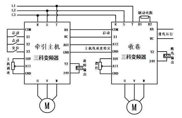 分別在牽引電機(jī)與收卷電機(jī)上應(yīng)用4級、2.2~7.5KW中使用三臺變頻器